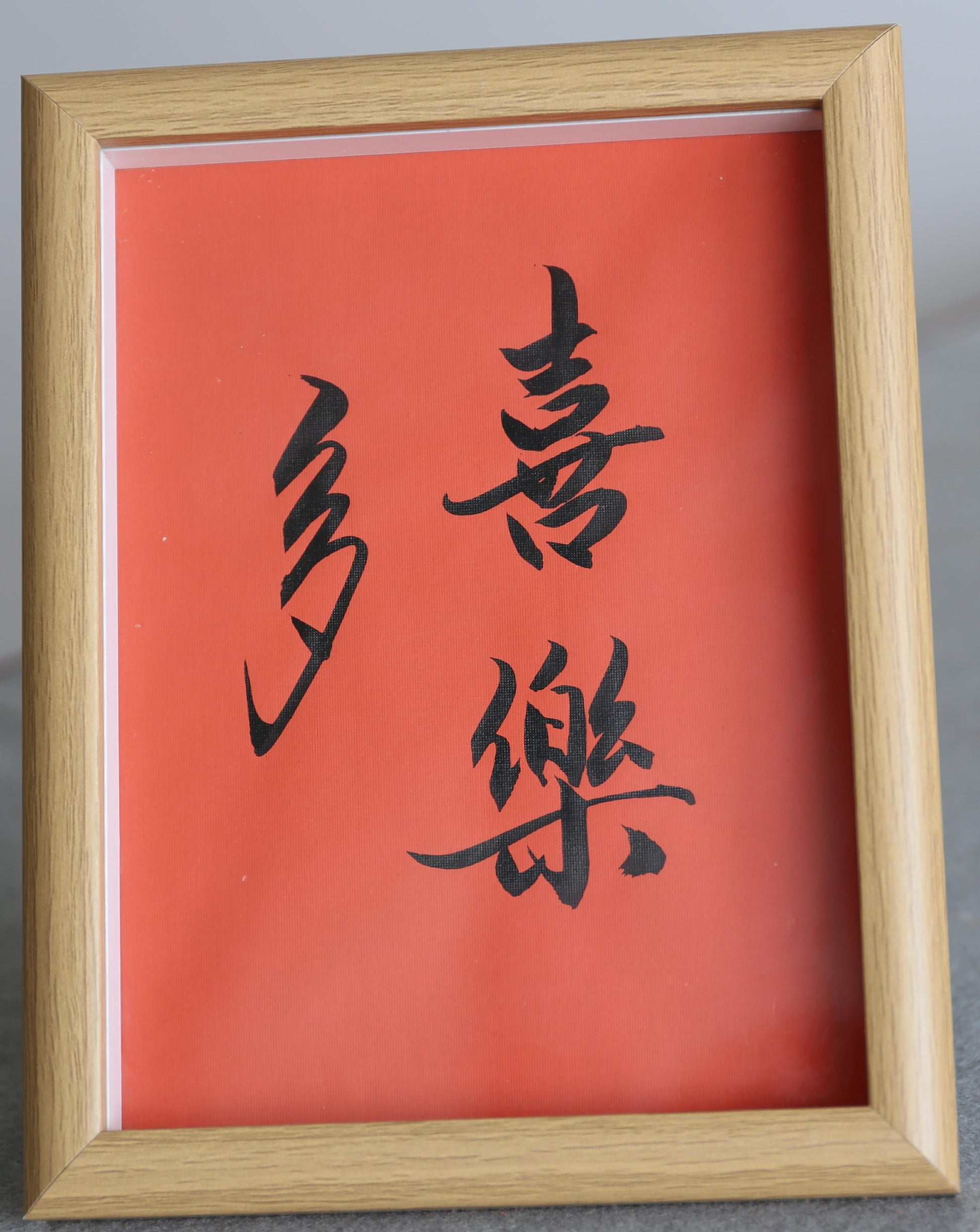 这幅书法作品以鲜艳的红色为背景,传递出浓厚的吉祥与喜悦氛围。“多喜乐”即“多些快乐、多些喜悦”,是对美好生活的朴素祝愿,通过书法的笔触、结构和整体布局,展现出一种独特的美感和韵味。黑色字体在红色背景的衬托下,显得格外醒目而有力,既体现了传统书法的魅力,又赋予了作品现代审美之感。整幅作品简洁而富有力量,无论是作为家居装饰,还是作为礼物赠送亲友,都能传递出深深的祝福和美好的愿望。