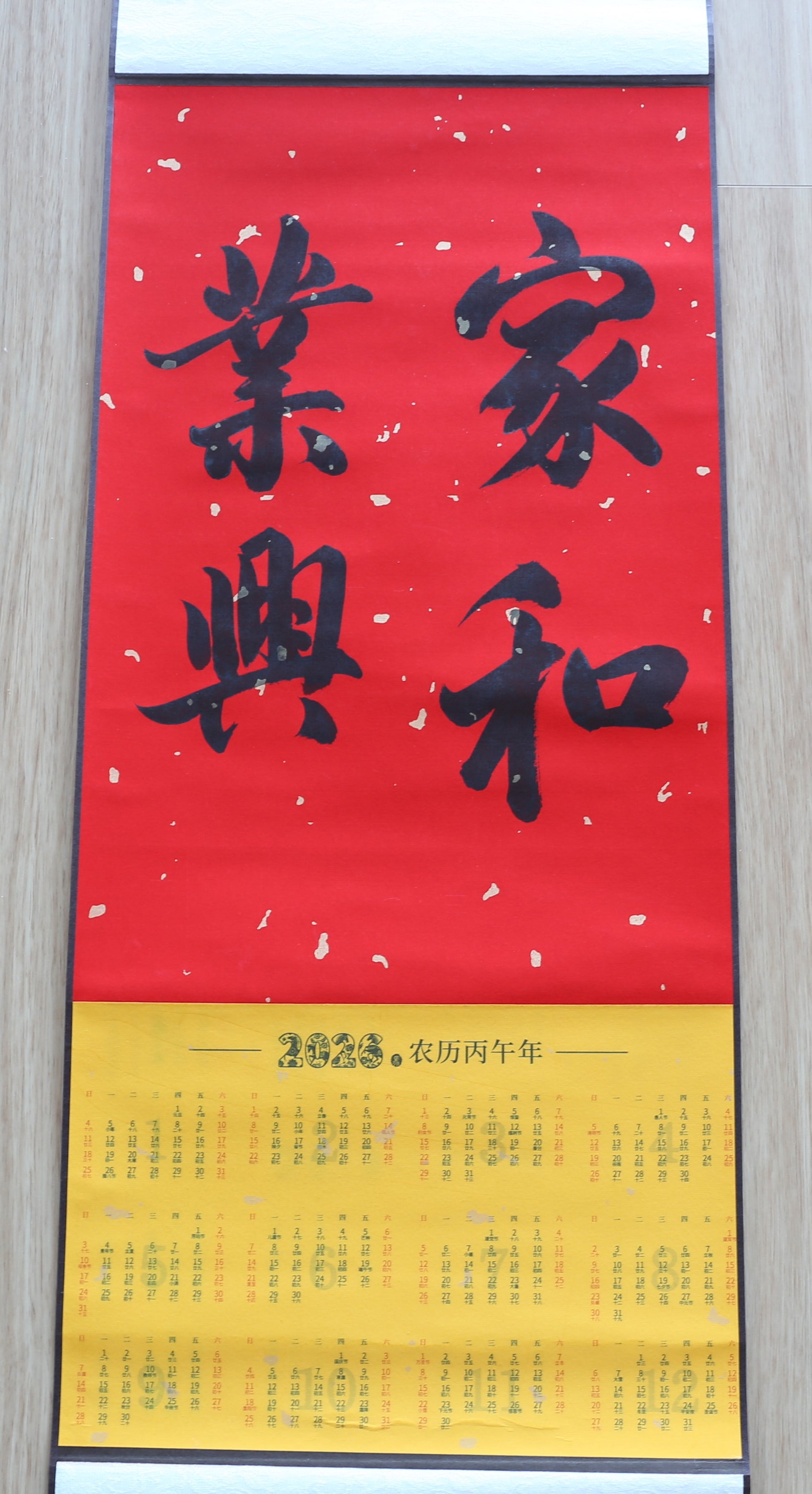 这是一个毛笔书法挂历作品,书写内容为“家和业兴”。作品以喜庆的中国红为主色,点缀金色碎纹,寓意祥瑞与富贵。字体雄健洒脱,笔势圆润中见力度,展现出传统书法的端庄与气韵。下方配有2026年农历挂历,兼具实用与艺术价值。“家和业兴”象征家庭和睦、事业昌盛,是新年佳节或居家装饰的吉祥之选。