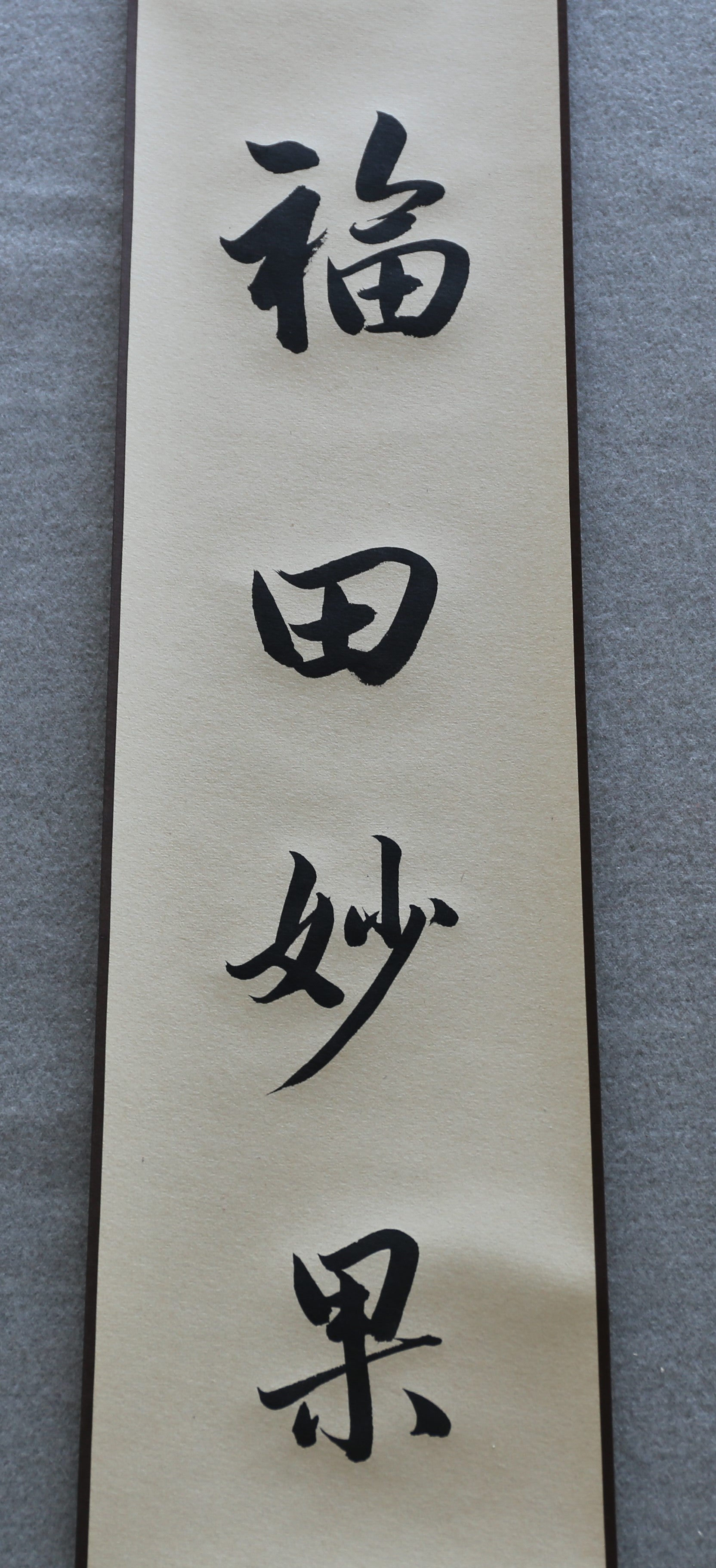 这幅毛笔书法作品书写的是“福田妙果”,寓意深远而祥和。作品以稳健的笔法与优雅的章法展现出书者的修养与心境,线条饱满、墨色浓淡相宜,极具传统美感。“福田妙果”源自佛家语,意指以善心播种福田,终得妙果圆成,象征善因善果、福泽绵长。整幅条幅制作考究,配以素雅底色与古典装裱,适合悬挂于书房、茶室或禅意空间,增添一份静谧与福气。