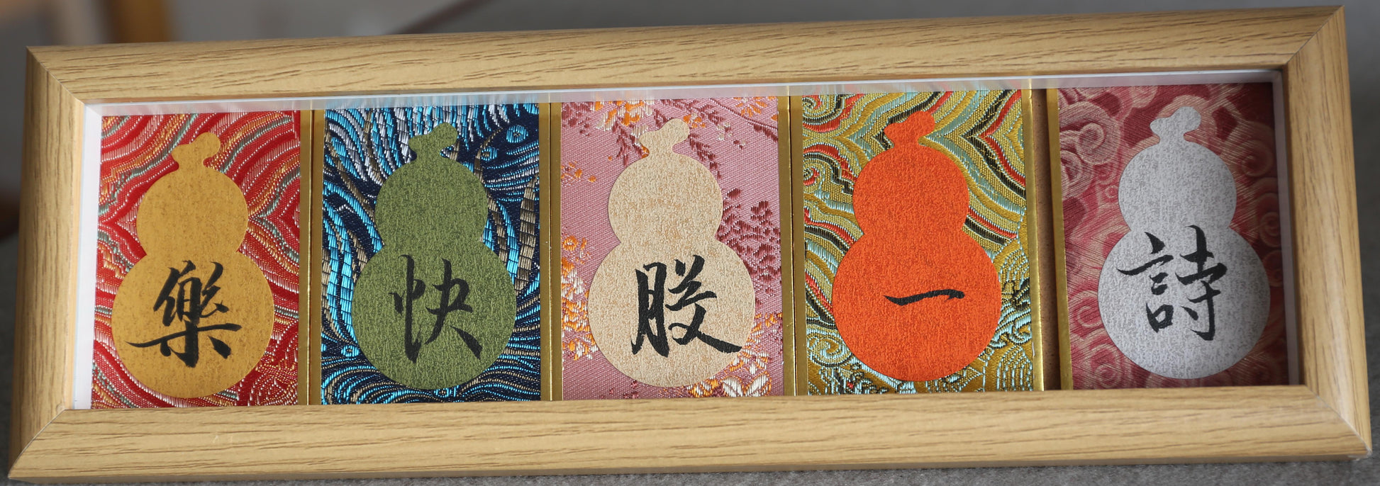 这幅毛笔书法作品题为《诗一般快乐》,以五个葫芦形为载体。色彩绚烂的织锦底纹与自然木框相映成趣,呈现出雅致与欢悦的融合之美。每个字以手写笔意挥洒,线条洒脱而富有韵律,寓意生活如诗,心境如歌。作品整体构图和谐,富有东方文化的意境与温度。无论陈设书房、客厅或文化空间,皆能增添一份雅趣与喜悦气息。